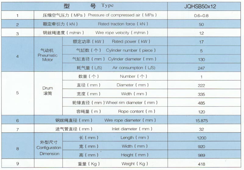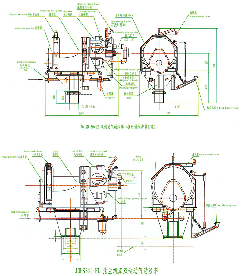 JQHSB50x12氣動絞車,采用壓縮空氣為動力,推動TMH17活塞式氣動馬達(dá)工作。再通過二級齒輪減速,把扭矩傳給滾筒。氣動絞車的操縱,是靠馬達(dá)體上的手操縱轉(zhuǎn)向閥實現(xiàn)正轉(zhuǎn)、反轉(zhuǎn)、停止等項動作。為保證氣動絞車的安全性,該氣動絞車還具有手、腳雙重剎車功能。特別適用于礦山、建筑工程以及海上、陸地油田鉆井平臺上使用。