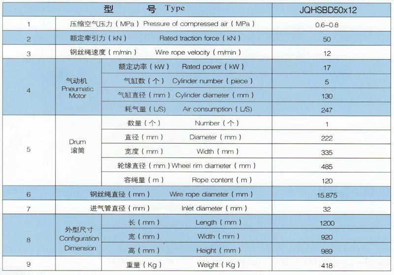 產(chǎn)品簡介JQHSBD50x12氣動絞車,采用壓縮空氣為動力,推動TMH17活塞式氣動馬達(dá)工作。再通過二級齒輪減速,把扭矩傳給滾筒。 氣動絞車的操縱