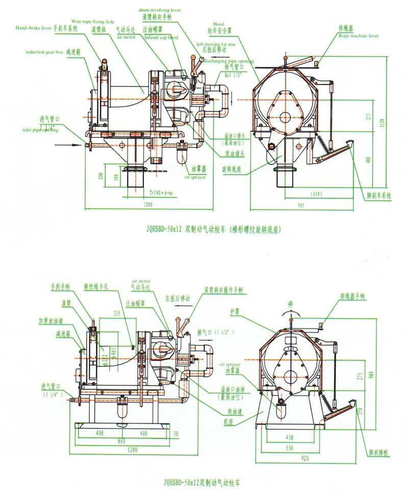 JQHSBD50x12氣動絞車,采用壓縮空氣為動力,推動TMH17活塞式氣動馬達(dá)工作。再通過二級齒輪減速,把扭矩傳給滾筒。 氣動絞車的操縱.是靠馬達(dá)體上的手操縱轉(zhuǎn)向閥實現(xiàn)正轉(zhuǎn)、反轉(zhuǎn)、停止等項動作。為保證氣動絞車的安全性,該氣動絞車還 具有手、腳雙重剎車功能。特別適用于礦山、建筑工程以及海上、陸地油田鉆井平臺上使用。