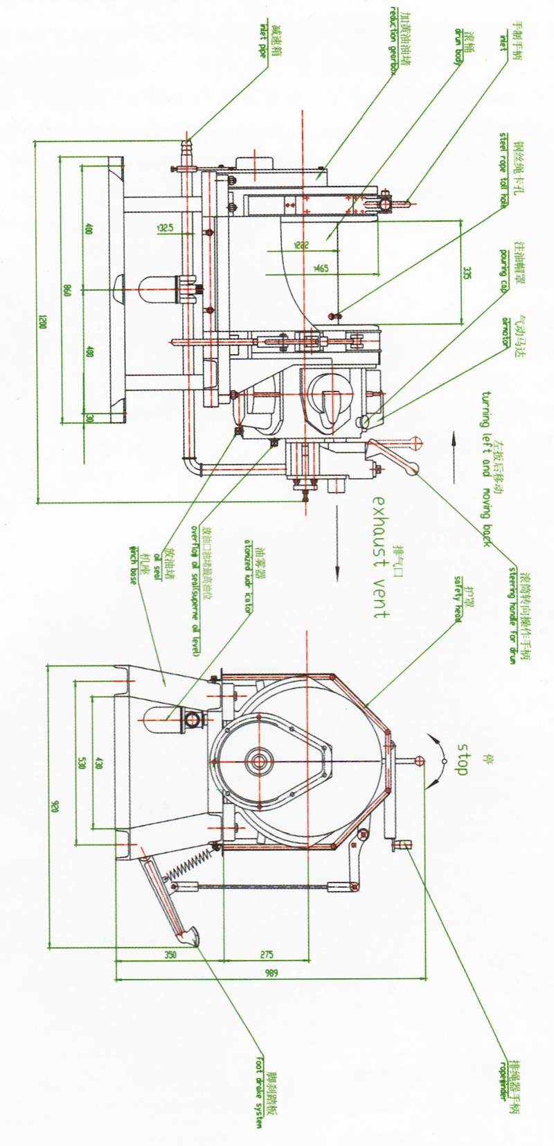 JQHSB50x12氣動(dòng)絞車.采用壓縮空氣為動(dòng)力,推動(dòng)TMH 17活塞式氣動(dòng)馬達(dá)工作。再通過二級(jí)齒輪減速.把扭矩傳給滾筒。 氣動(dòng)絞車的操縱,是靠馬達(dá)體上的手操縱轉(zhuǎn)向閥實(shí)現(xiàn)正轉(zhuǎn)、反轉(zhuǎn)、停止等項(xiàng)動(dòng)作。為保證氣動(dòng)絞車的安全性,該氣動(dòng)絞車還 具有手、腳雙重剎車功能。特別適用于礦山、建筑工程以及海上、陸地油田鉆并平臺(tái)上使用。